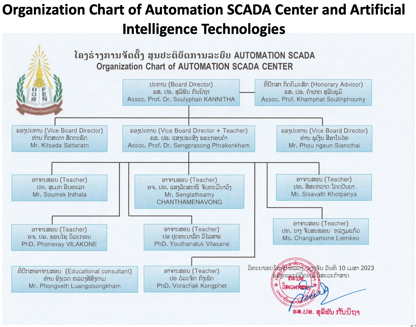 The Automation SCADA and AI (Artificial Intelligence) Operation Center was established in 2023 as a collaboration between the Faculty of Engineering at Lao National University and E-Advance Technologies. It is the first automation and AI operation center in Lao PDR. The purpose of this program is to develop human resources in the field of modern technology. It aims to provide students with opportunities to access learning resources, understand how to use technological systems correctly, develop problem-solving skills, and improve their ability to innovate in automation and artificial intelligence technologies independently in the future.
